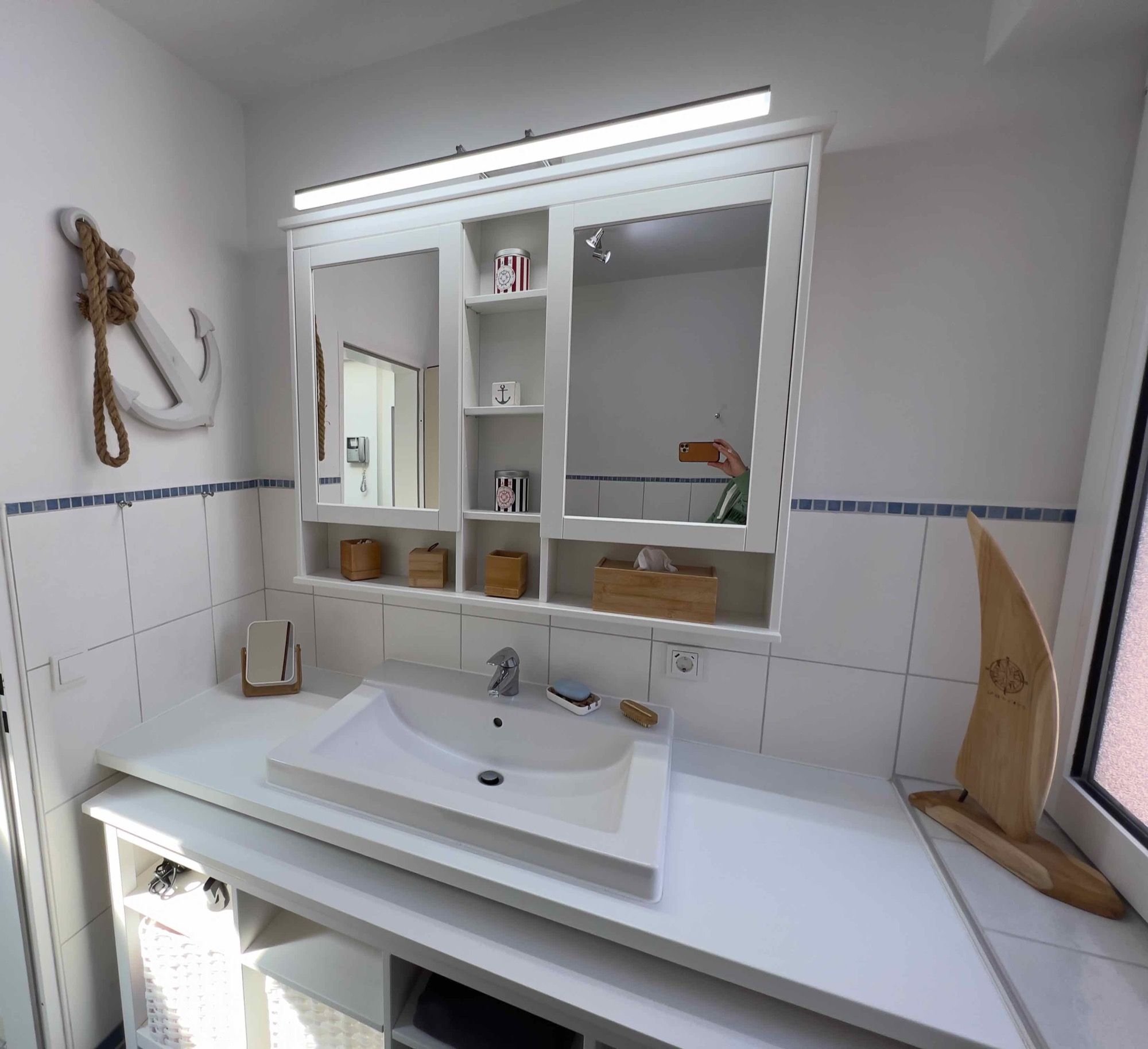 Das Kleine Bad bietet mehr als nur ein WC. Es hat Stauraum und viel Licht. Damit hat das kleine Schlafzimmer sein eigens Bad und eine Familie oder auch Paare können sich besser verteilen.