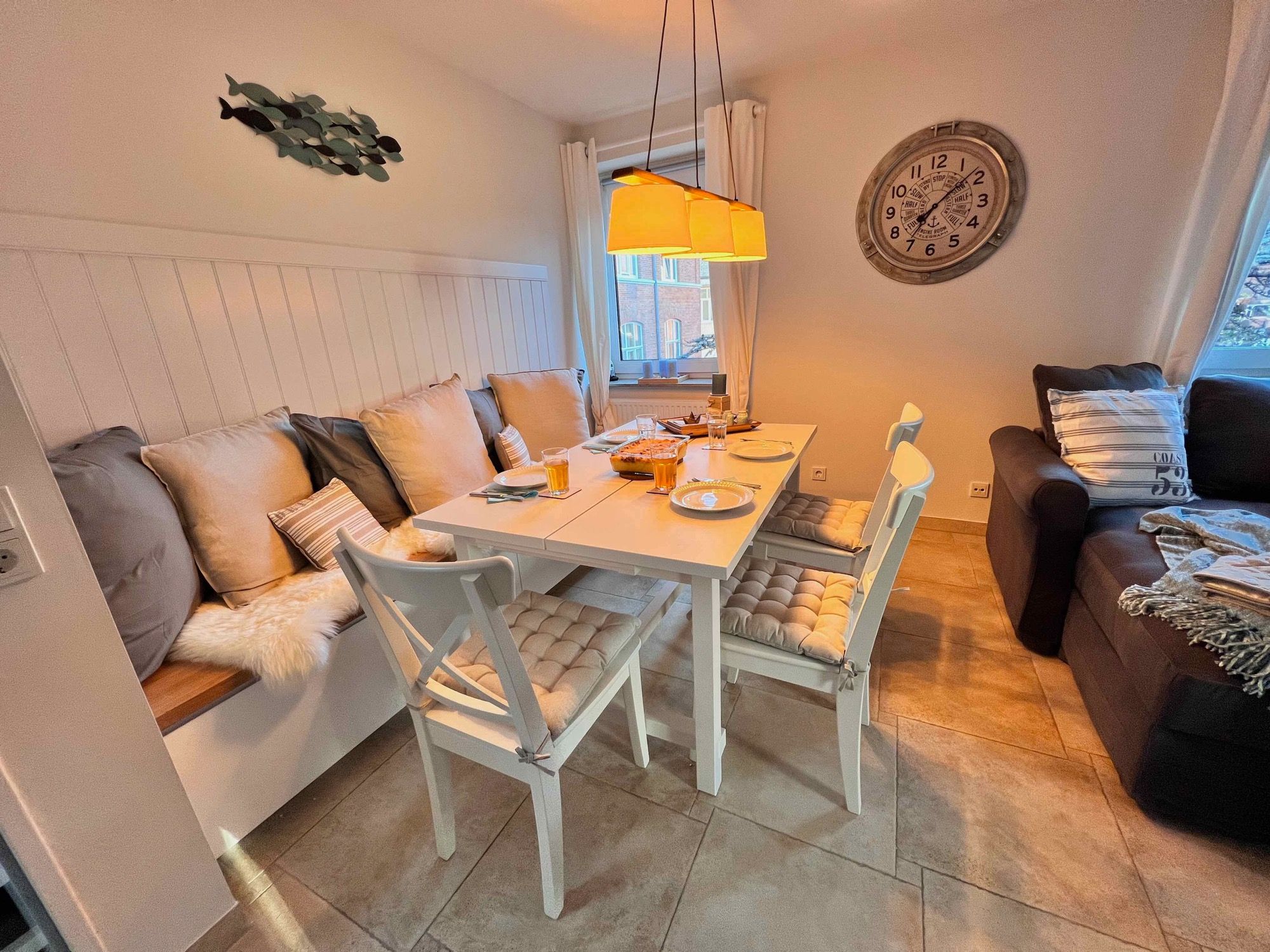 Das Wohnzimmer bietet eine großzügige Essecke mit einem Tisch für bis zu sechs Erwachsene, einem Hochstuhl und einem Kinderstuhl. Der Tisch lässt sich einfach ausziehen und dadurch auch für eine größere Tafel decken.